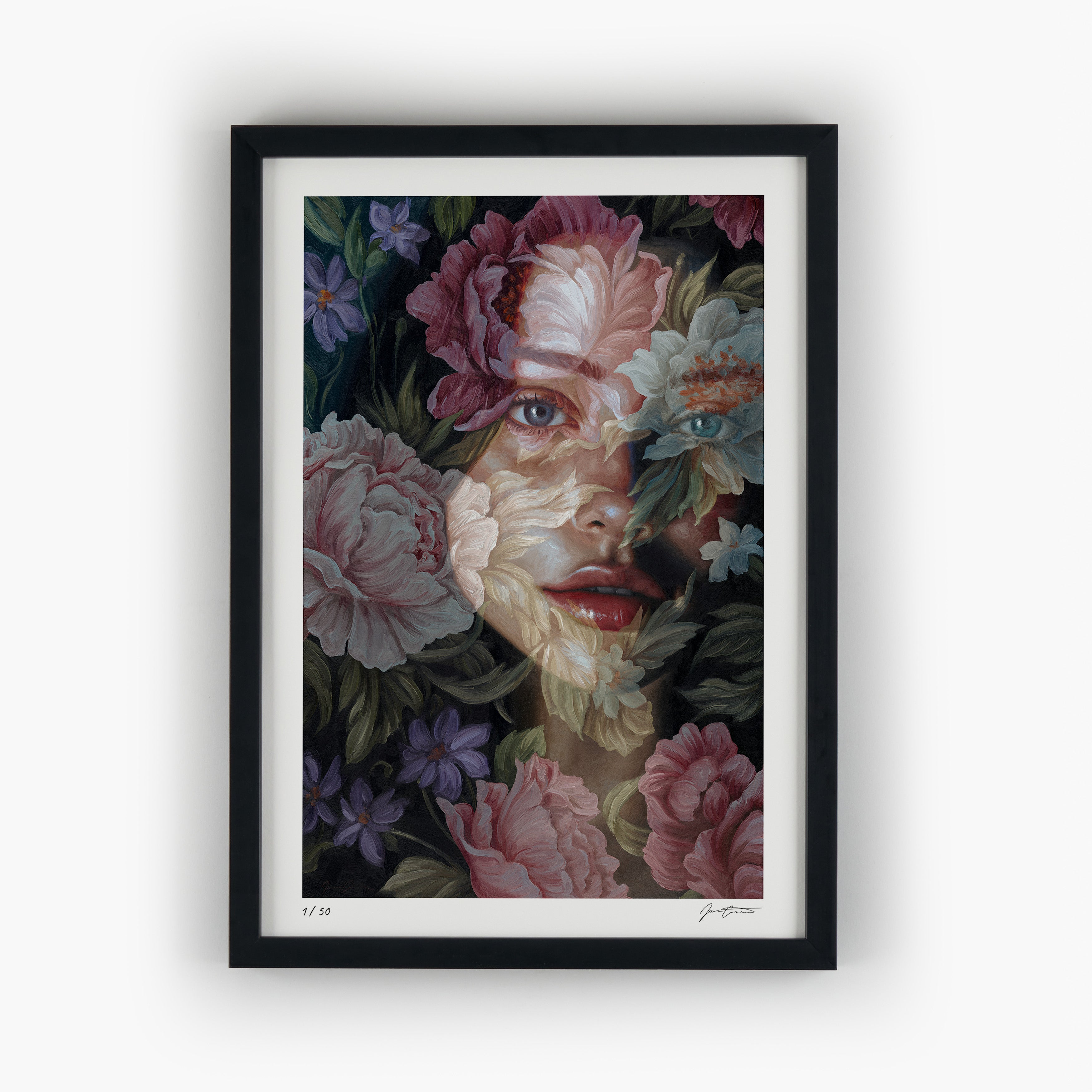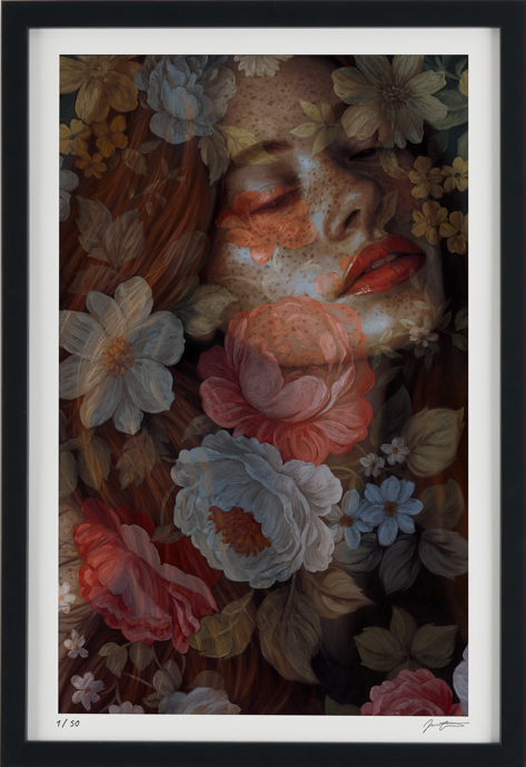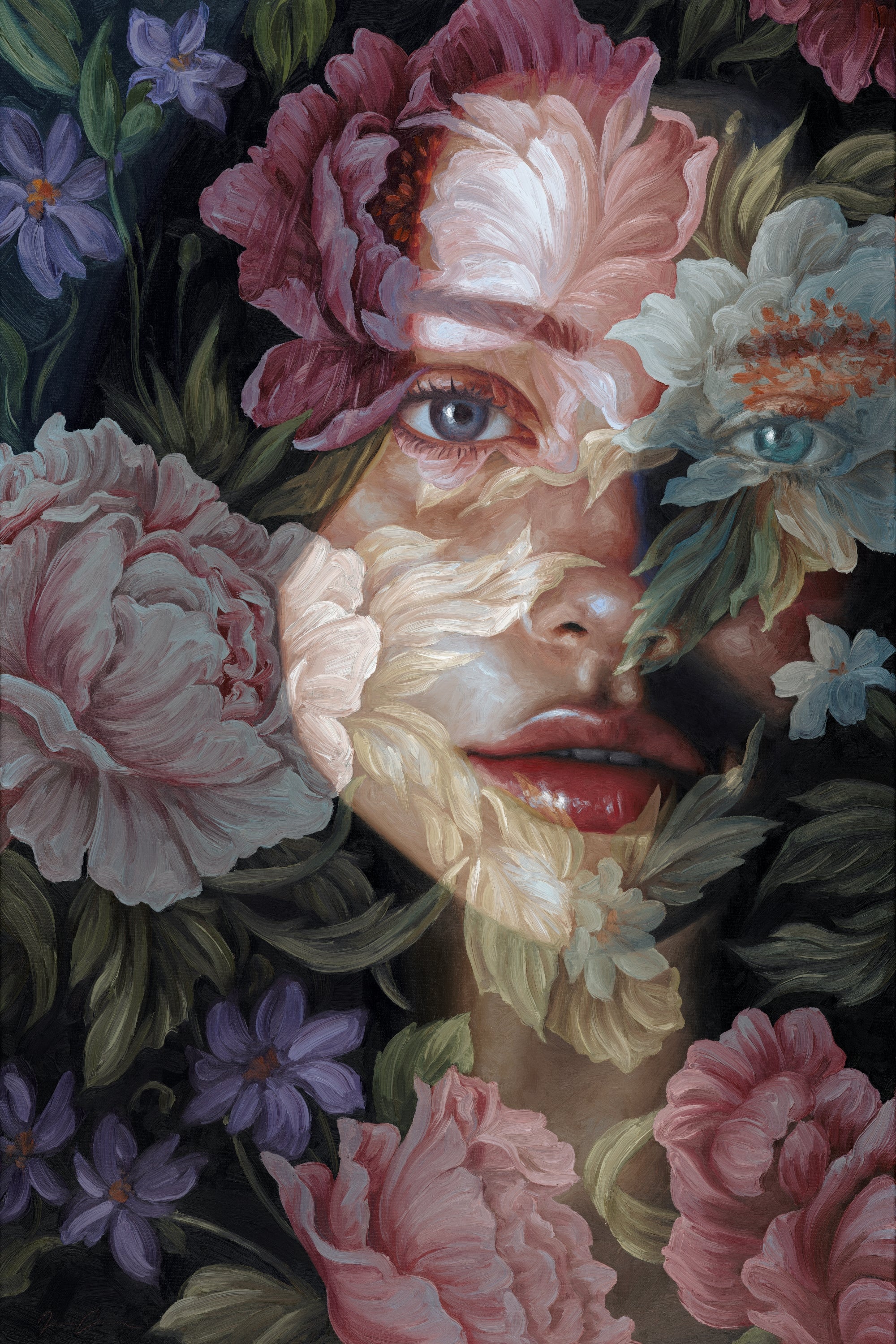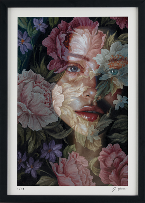 Interwoven with translucent blooms, these two portraits linger between inner and outer worlds—where softness meets resilience, and memory is deeply rooted in nature. Each piece holds a quiet tension: between the impulse to retreat, and the courage it takes to remain open. Together, they reflect a longing to find home in beauty, in presence, and in the wild, tender spaces we carry within.