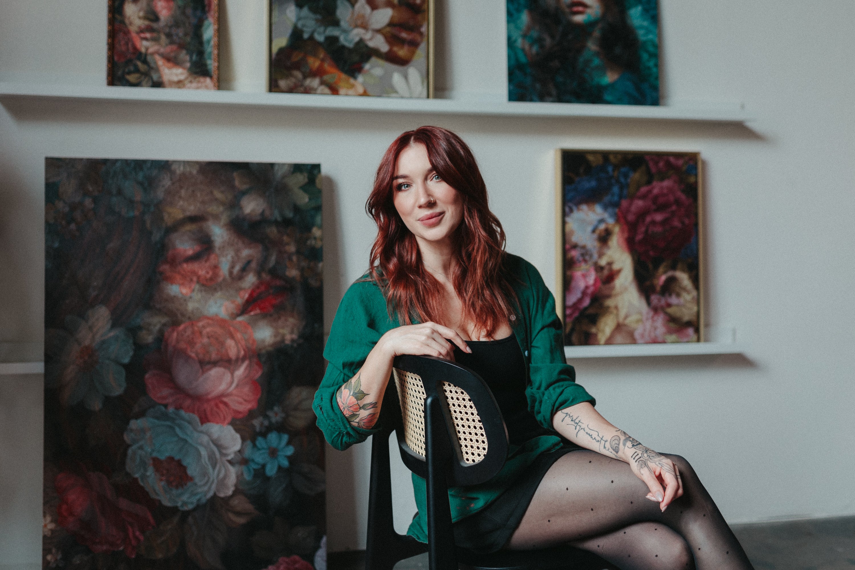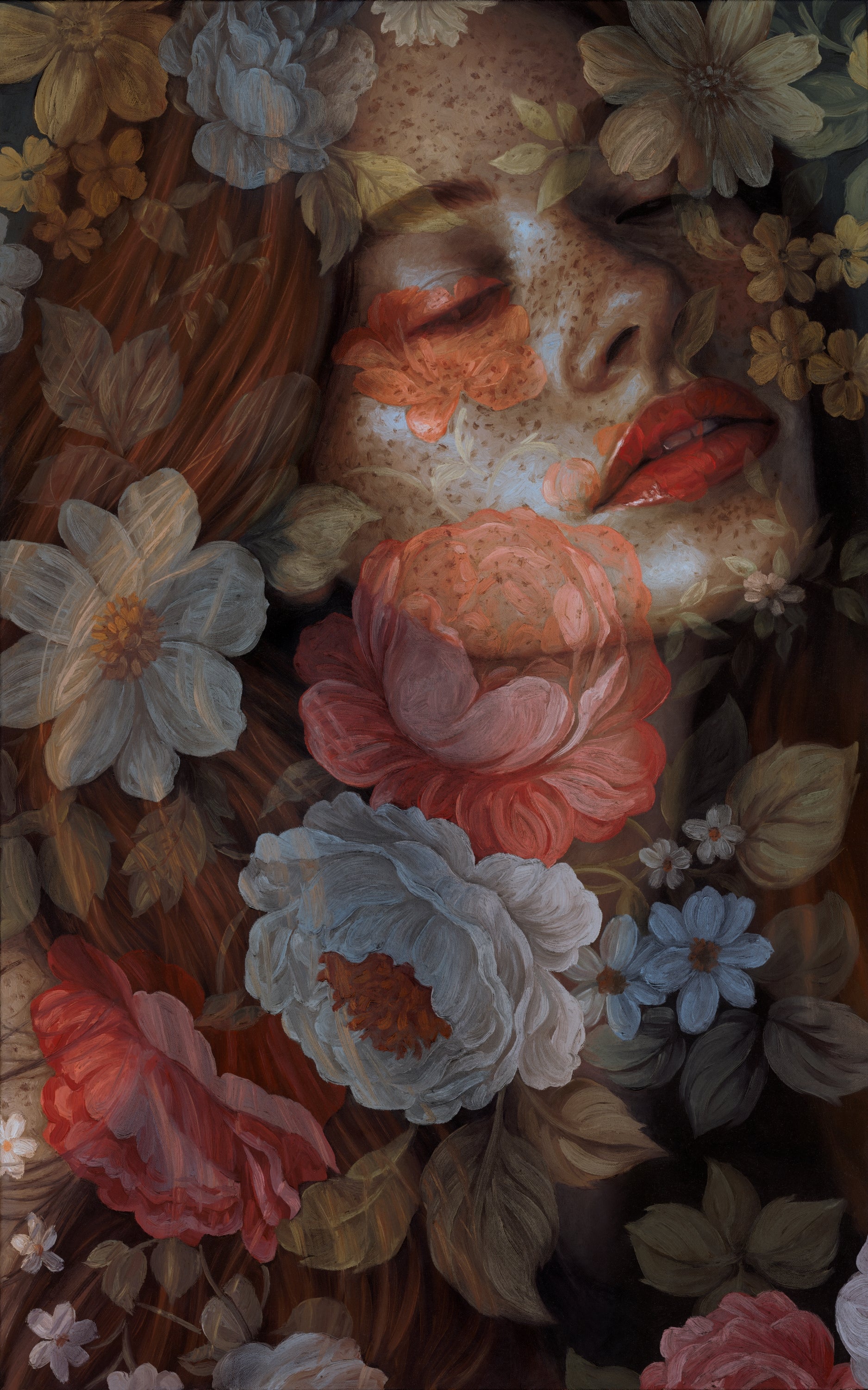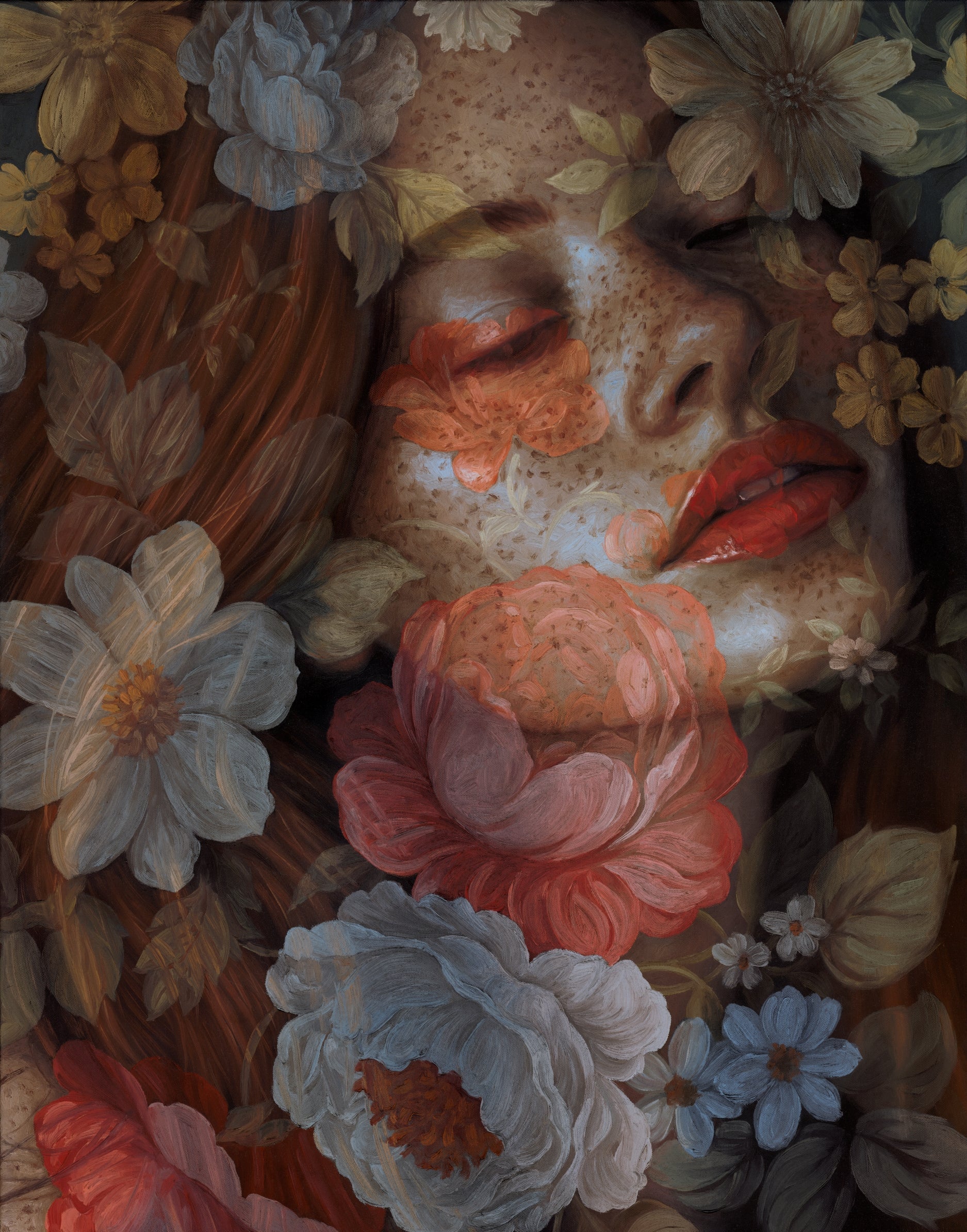 Interwoven with translucent blooms, these two portraits linger between inner and outer worlds—where softness meets resilience, and memory is deeply rooted in nature. Each piece holds a quiet tension: between the impulse to retreat, and the courage it takes to remain open. Together, they reflect a longing to find home in beauty, in presence, and in the wild, tender spaces we carry within.
